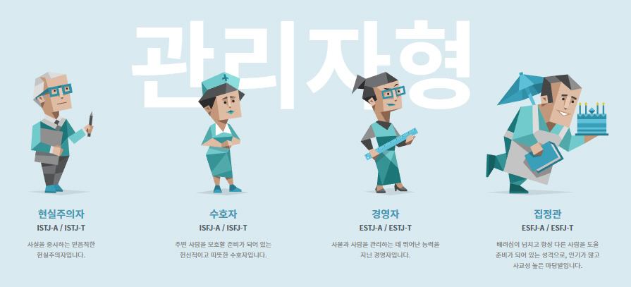- 판단형 : 계획을 세우고 조직적으로 일을 처리하는 것을 선호합니다.